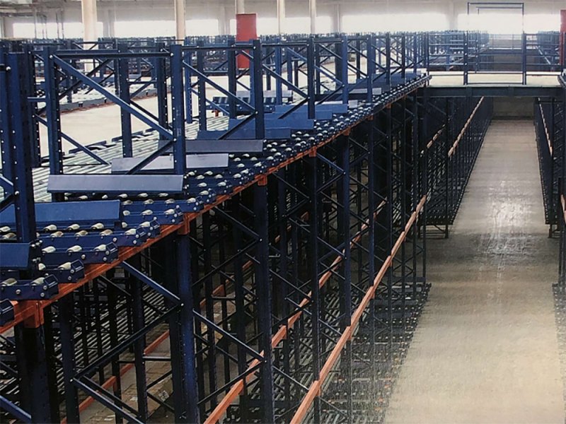 采用辊子式轨道或底轮式托盘,利用货物的自重,实现货物的先进先出,适合于大批量同类型货物的存储,空间利用率很高。